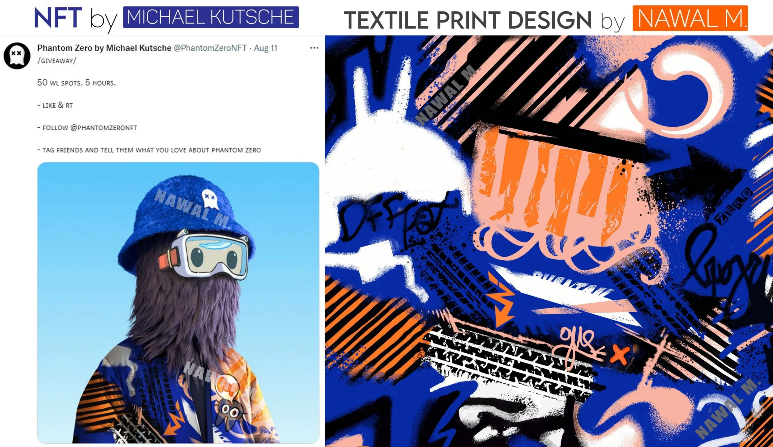 Graphic design featuring graffiti-style art with vibrant blue, orange, black, and white colors, including text, scribbles, and abstract patterns, promoting NFT artwork by Michael Kutsche and textile print design by Nawal M. with a focus on street art View fullsize