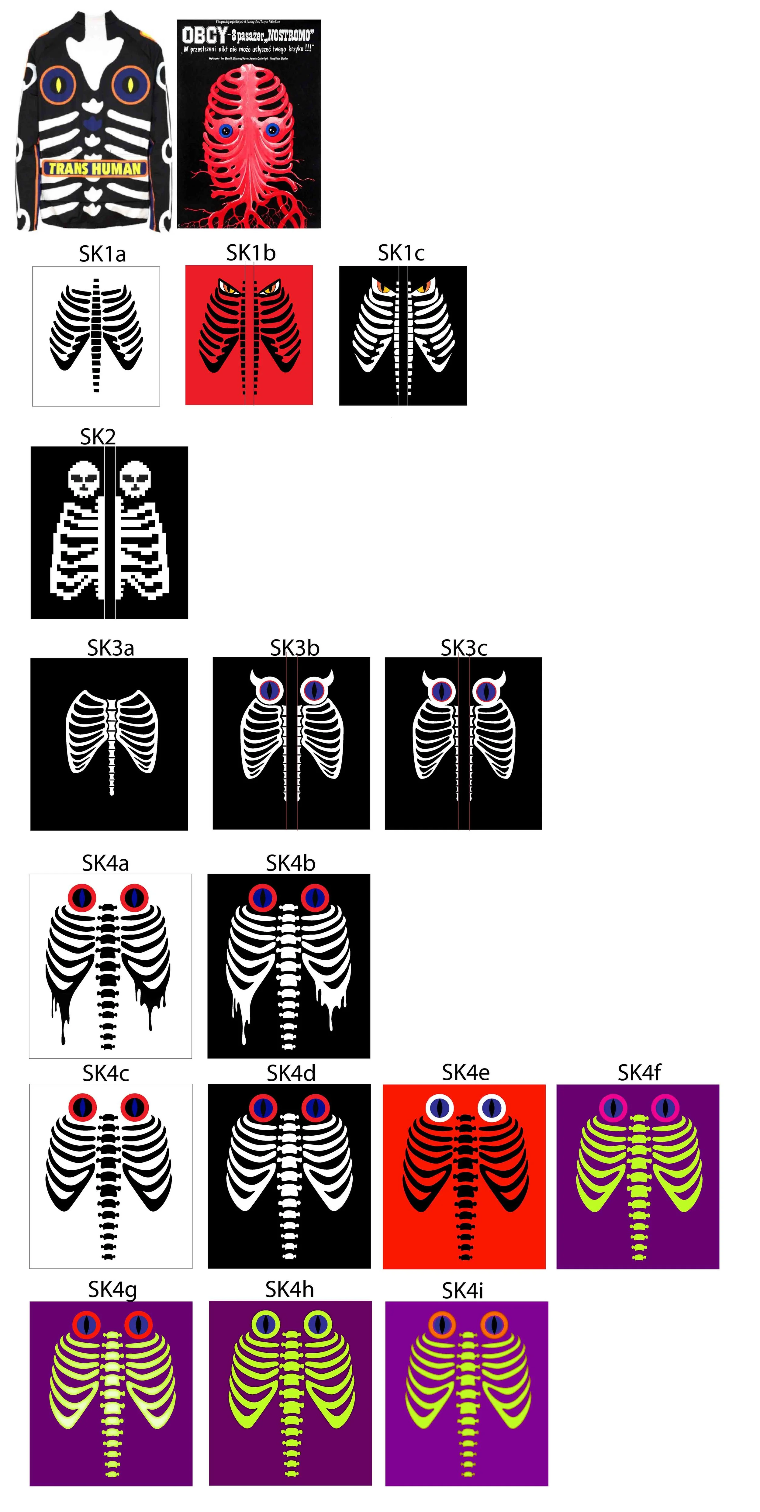 A compilation of skeletal illustrations with different colors, styles, and modifications, along with two reference images at the top—one of a skeleton with some clothing and one of a skeletal artwork with a red skeleton face.
