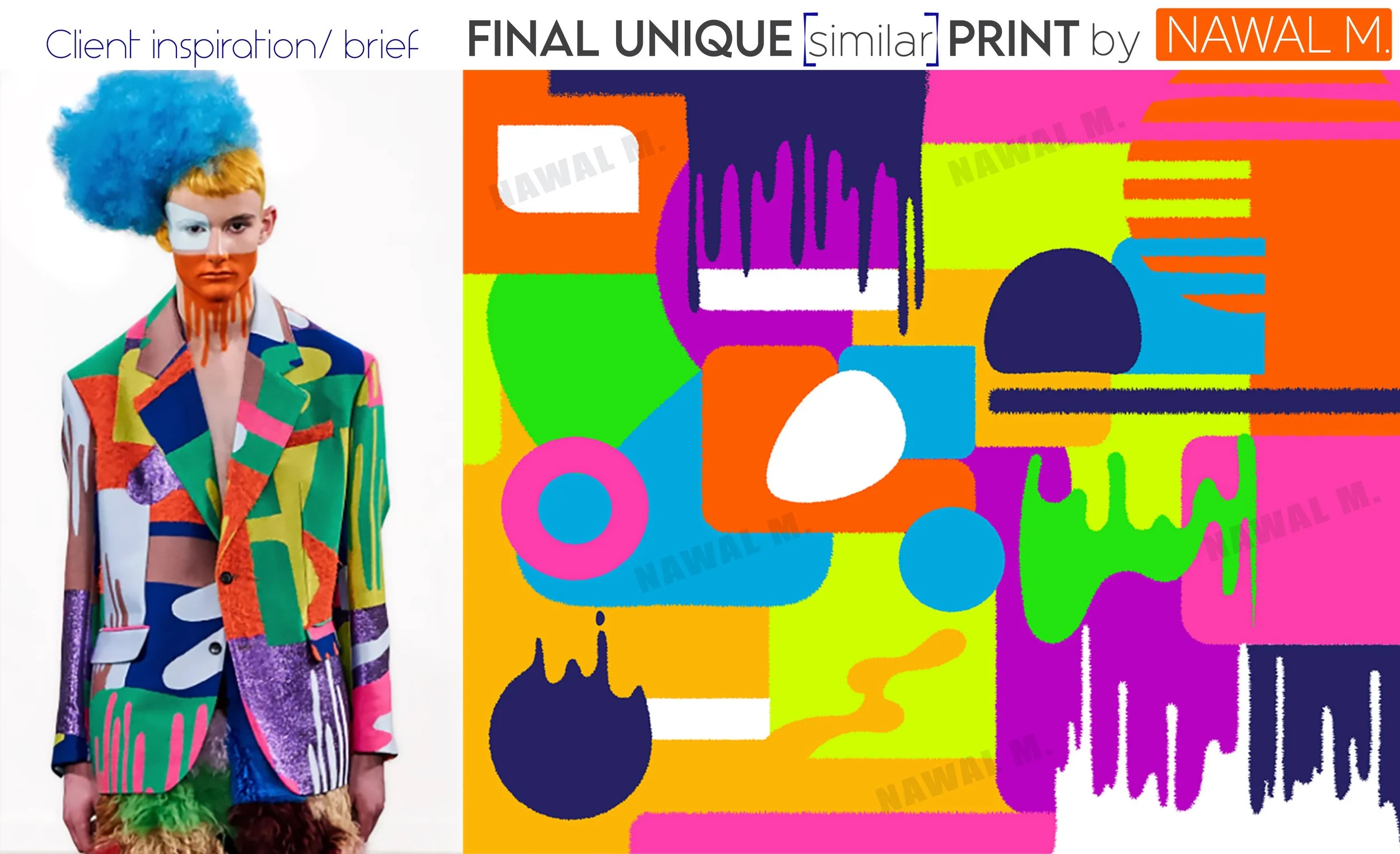 Graphic design collage featuring a colorful, abstract, geometric composition on the right and a model wearing a vibrant, patterned blazer on the left. The image is labeled 'Client inspiration/brief' at the top, with the text 'FINAL UNIQUE [similar] P