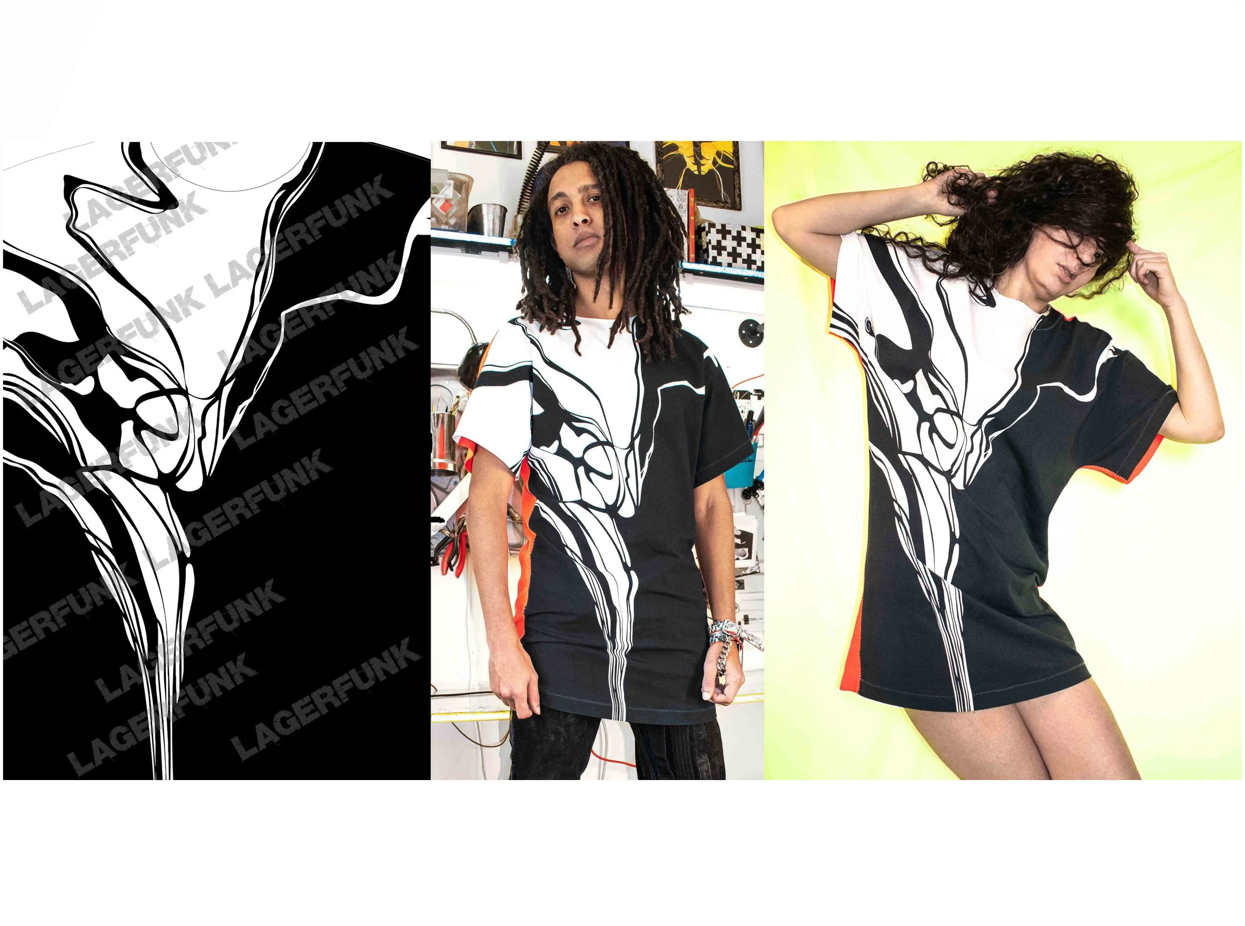 A collage featuring two photos of a woman wearing the same abstract black and white shirt with orange accents, with the left side showing a stylized outline and the right side showing her posing with one hand behind her head against a plain backgroun