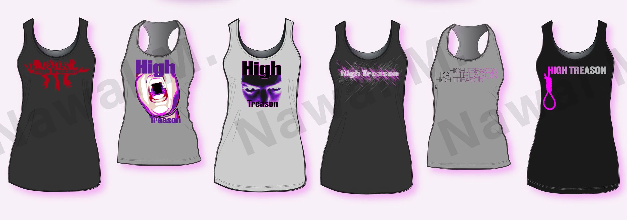 Six tank tops with various "High Treason" and related graphic designs in black and gray colors with pink and purple accents. View fullsize