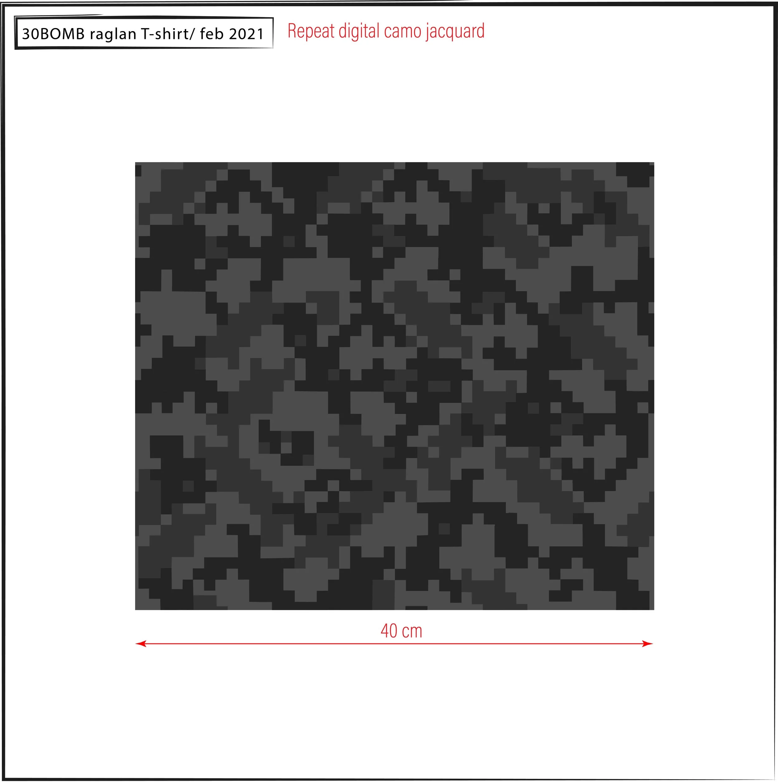 Gray and black digital camouflage pattern on a 40 cm by 40 cm textile sample labeled '30BOMB raglan T-shirt/ feb 2021' with red text 'Repeat digital camo jacquard' at the top right.