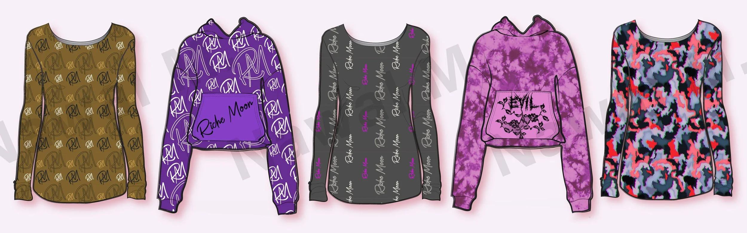 Five hoodies with different designs and colors displayed side by side. View fullsize