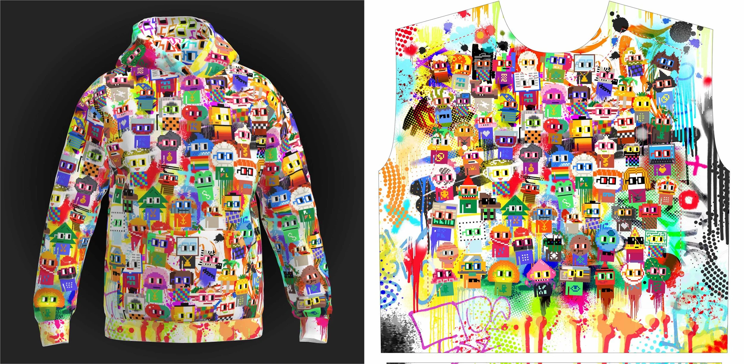 A colorful hoodie with a pixel art design of various cartoon characters and a graphic print hoodie with similar pixel art characters and paint splatter background.