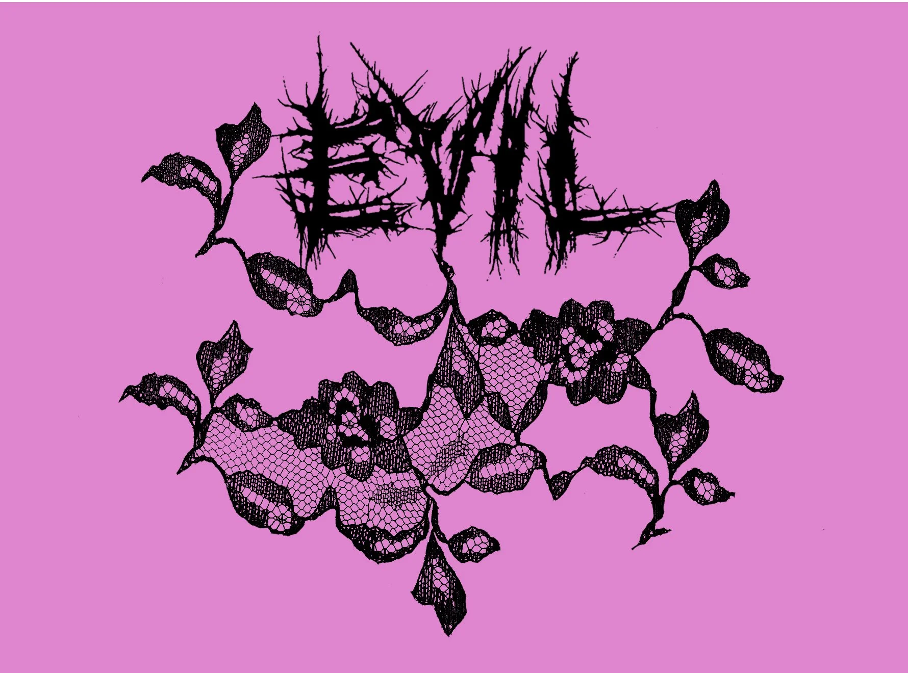 Black lace outline of a floral design over a pink background.