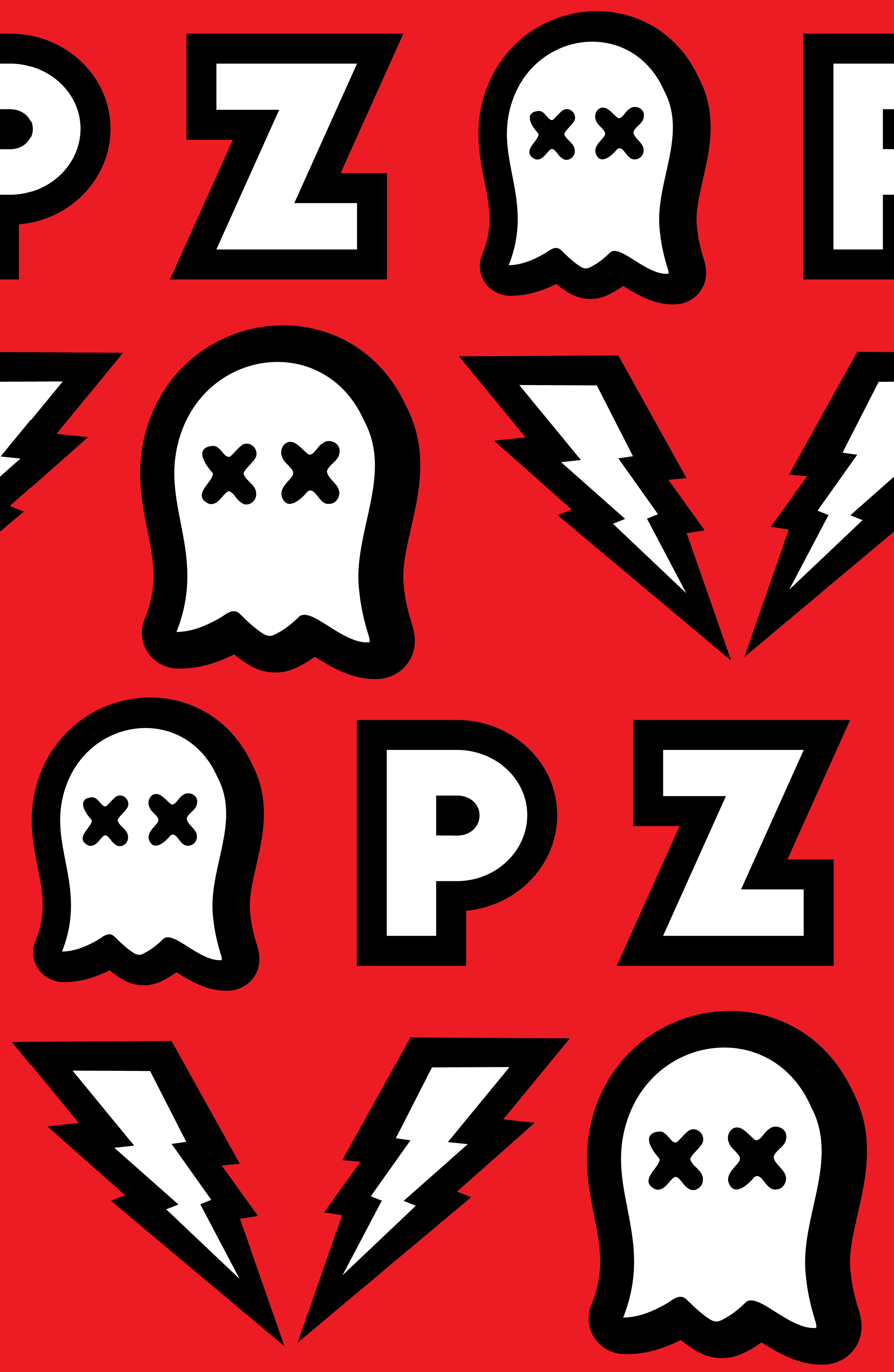 Pattern of white ghost faces, lightning bolts, and the word 'PZZ' on a red background.